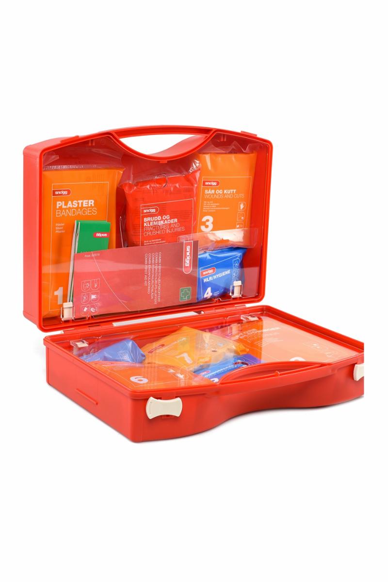 Førstehjelpskofferten skal være sentralt plassert og holdes komplett for maksimal beredskap. Egner seg bra på anleggsområder og i produksjonslokaler.