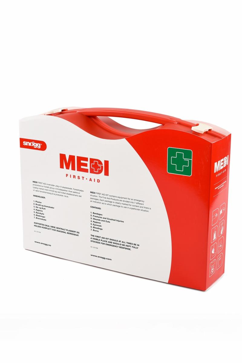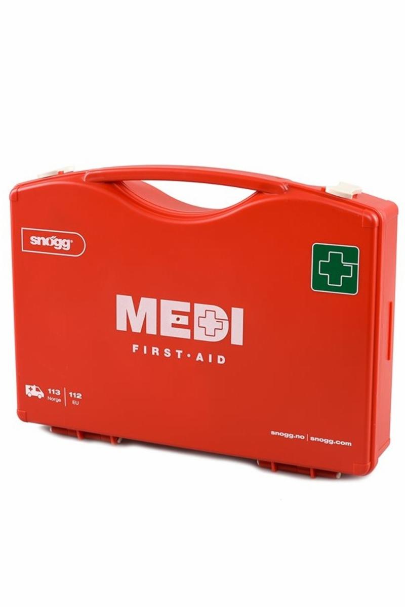 Snøggkofferten Medi er en førstehjelpskoffert i medium størrelse. Kofferten har nytt oppgradert innhold og innholdet er pakket i nummererte poser med piktogrammer og tekst som viser bruksområde.