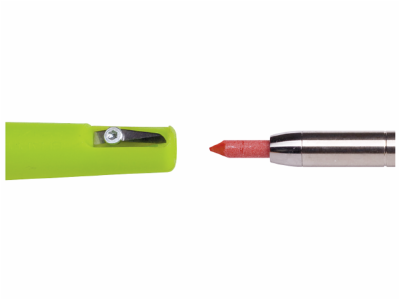 Grafittstiften har hardhetsgrad 2B, litt mykere enn en standardhard tømmermannsblyant, og fester dermed bedre på flere underlag.