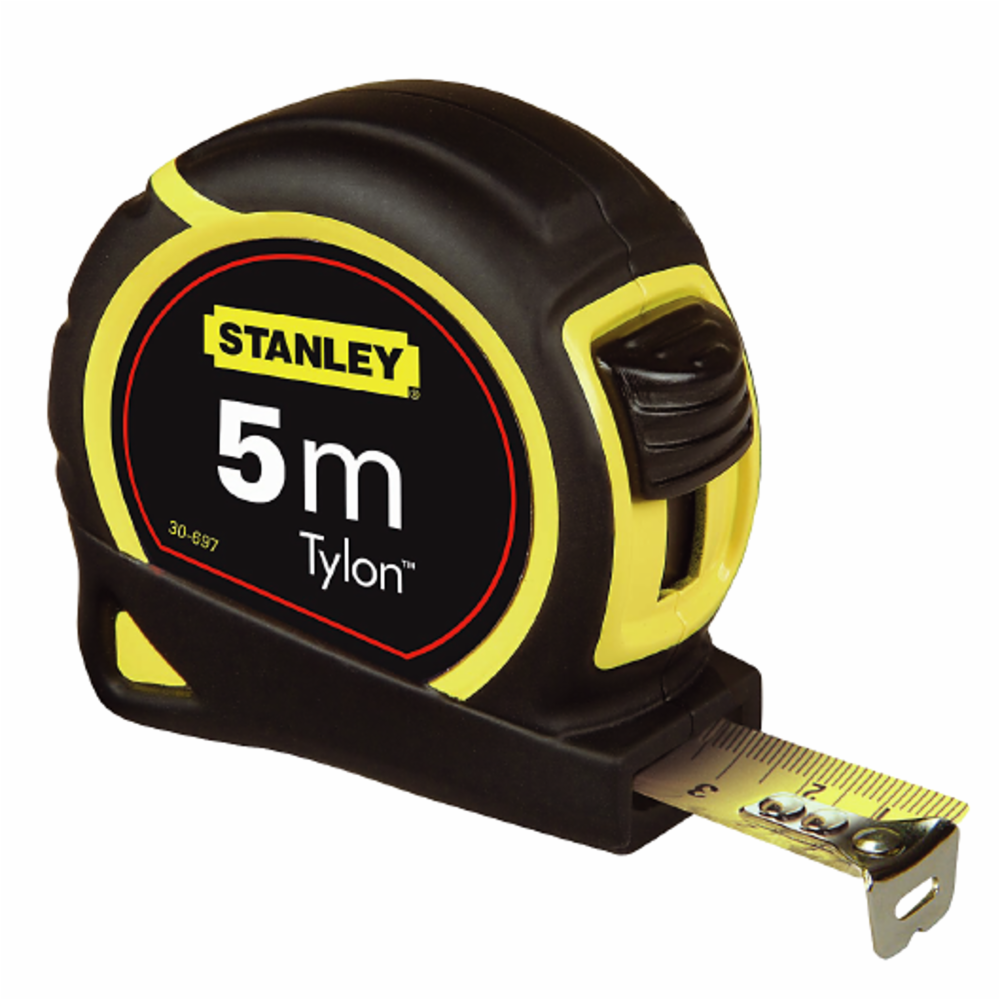 Målebånd med gullakkert stålbånd i robust plastkapsel med gummiinnlegg.