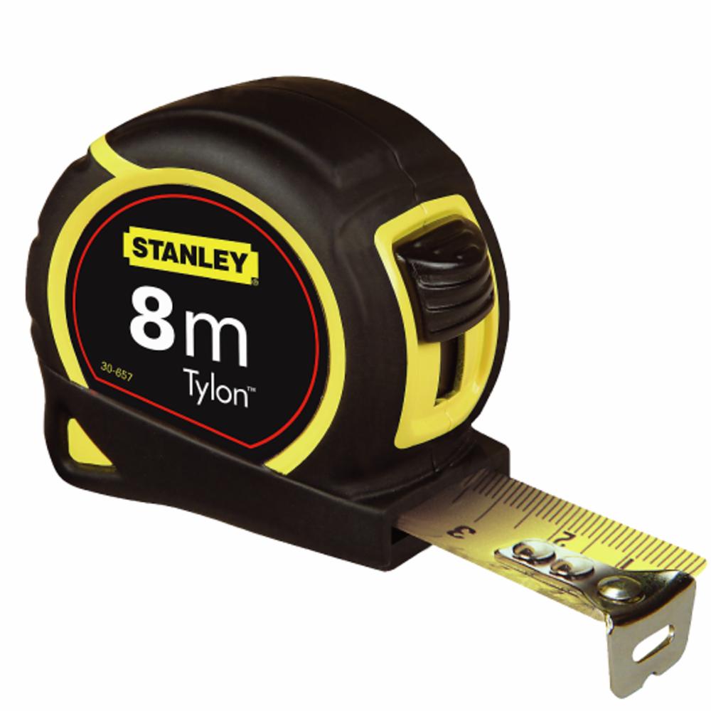 Stanley Tylon. Målebånd med gullakkert stålbånd i robust plastkapsel med gummiinnlegg.