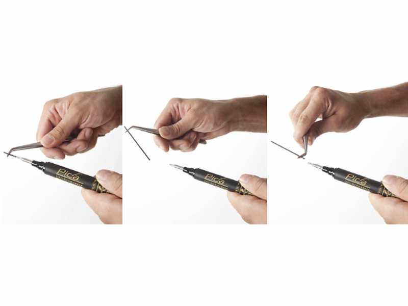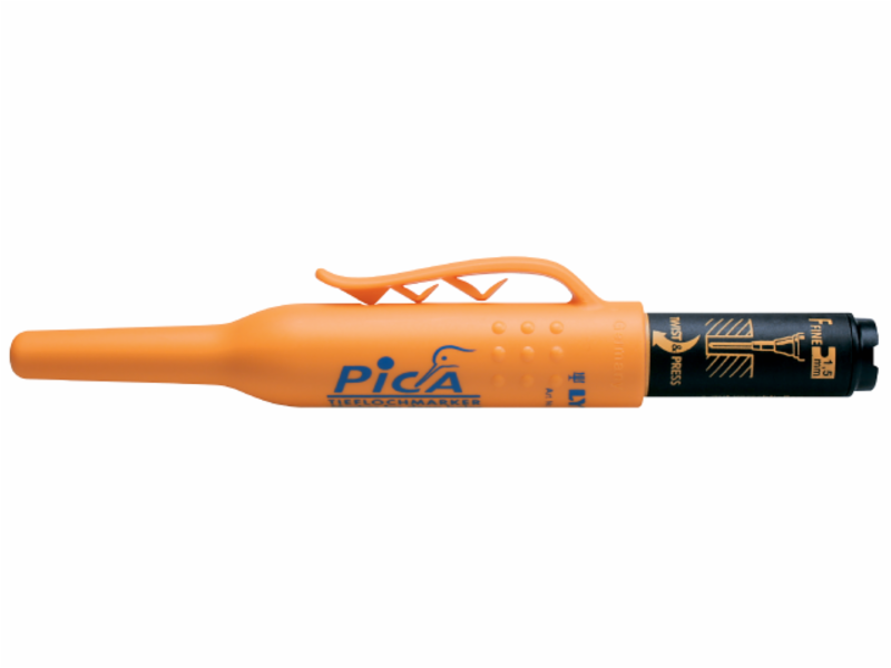 Pica Ink. Tusj for oppmerking i smale og dype hull. Teleskopisk spiss i rustfritt stål og med en diam. 1.5 mm slik at man enkelt kommer igjennom konsoller til f.eks. skruehull. Pennkroppen er i plast, som gjør at den ikke leder strøm. For permanent merking på alle tørre flater/materialer. Hetten er utstyrt med belteklips for enkel oppbevaring i bukse- eller verktøylomme. Blekket kan fjernes med alkohol eller lignende, hvis det trengs. Hvis pennen har "tørket" - sett på hetten og la den ligge i noen dager, så er den i orden igjen. Hvis spissen er blitt flisete kan man klippe av den ytterste millimeteren så blir spissen som ny igjen. Dette kan gjøres flere ganger da spissen er teleskopisk og kan skyves frem og tilbake. Man kan også ta ut hele stiften og rotere den 180° så blir spissen som ny.