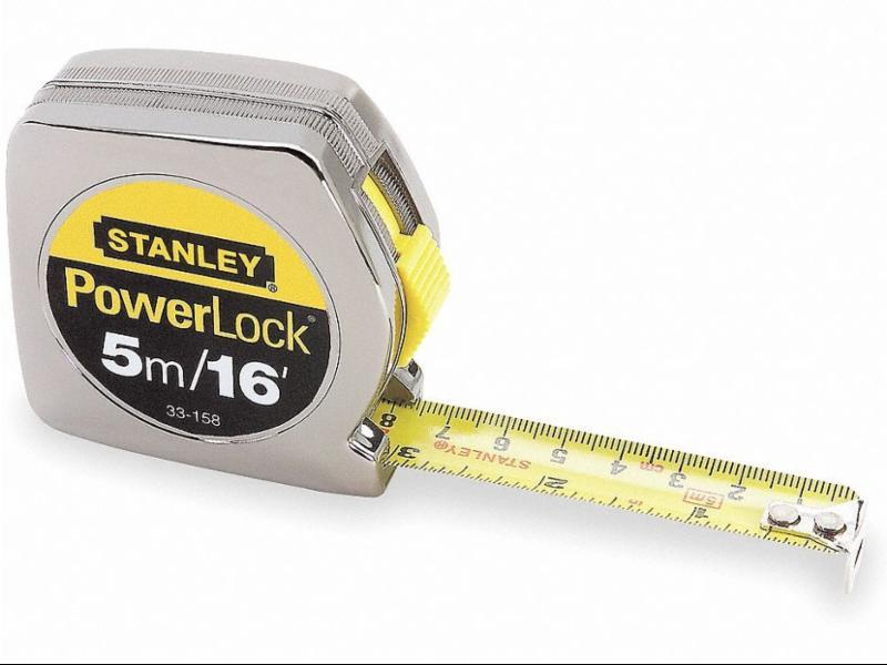 Stanley Type Powerlock. Med gult beskyttelseslakkert bånd. Dekket med Mylar Polyesterplast som beskytter mot slitasje og forlenger holdbarheten opp til 10 ganger. I forkrommet plastkapsel med plan underside for innvendig måling. Selvopprullende bånd med låseanordning. Bevegelig endehake. Belteklips. Målebånd 10 m har fjærende gummidemping ved opprulling av båndet.