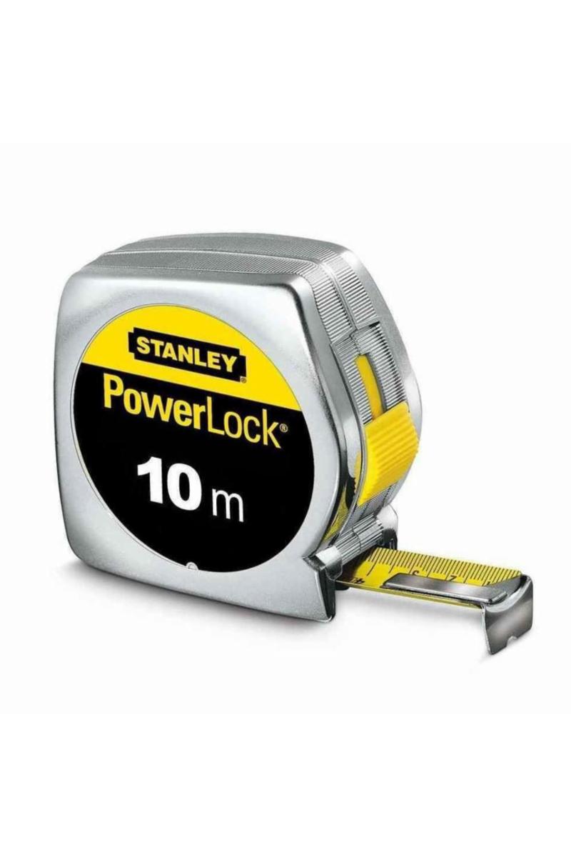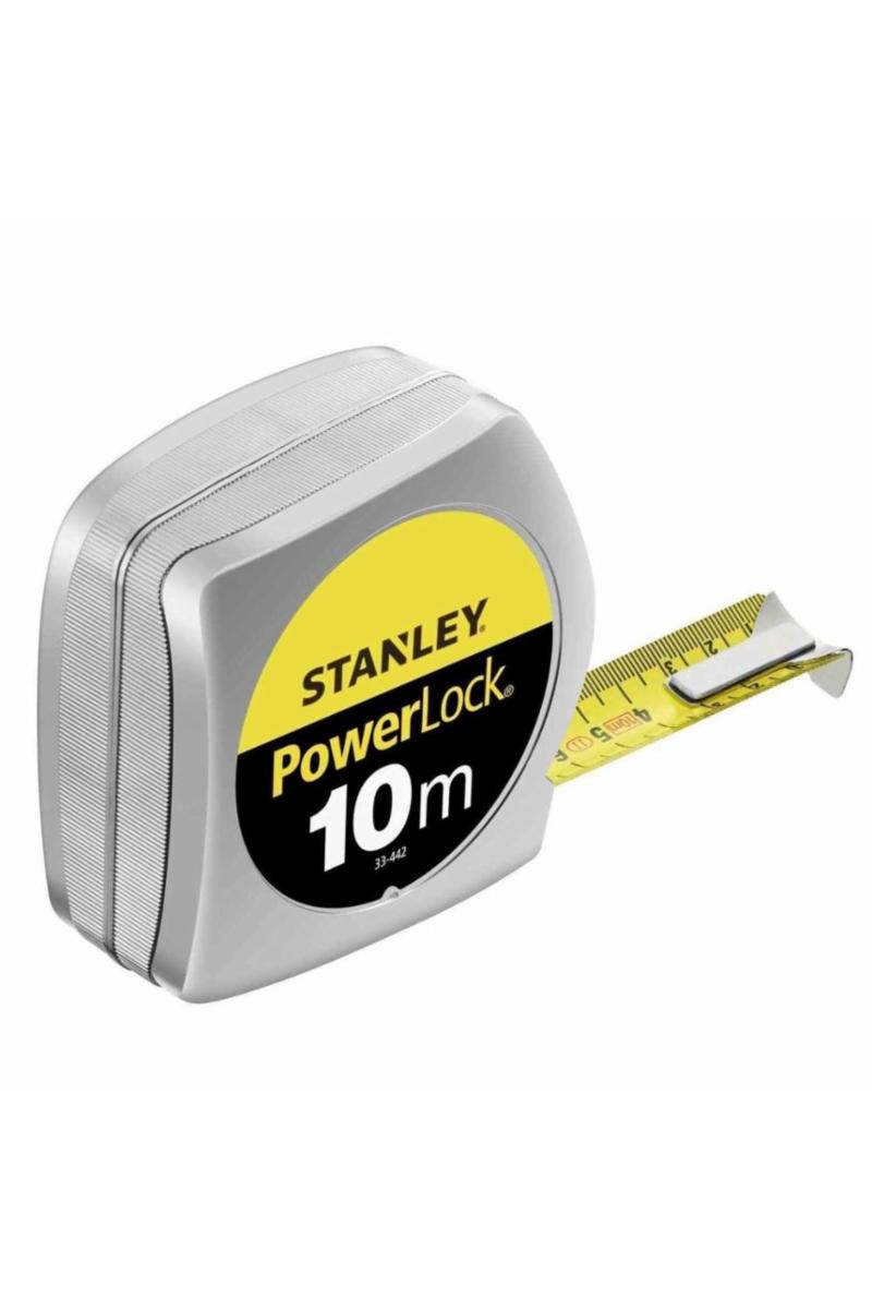 Stanley Type Powerlock. Med gult beskyttelseslakkert bånd. Dekket med Mylar Polyesterplast som beskytter mot slitasje og forlenger holdbarheten opp til 10 ganger. I forkrommet plastkapsel med plan underside for innvendig måling. Selvopprullende bånd med låseanordning. Bevegelig endehake. Belteklips. Målebånd 10 m har fjærende gummidemping ved opprulling av båndet.