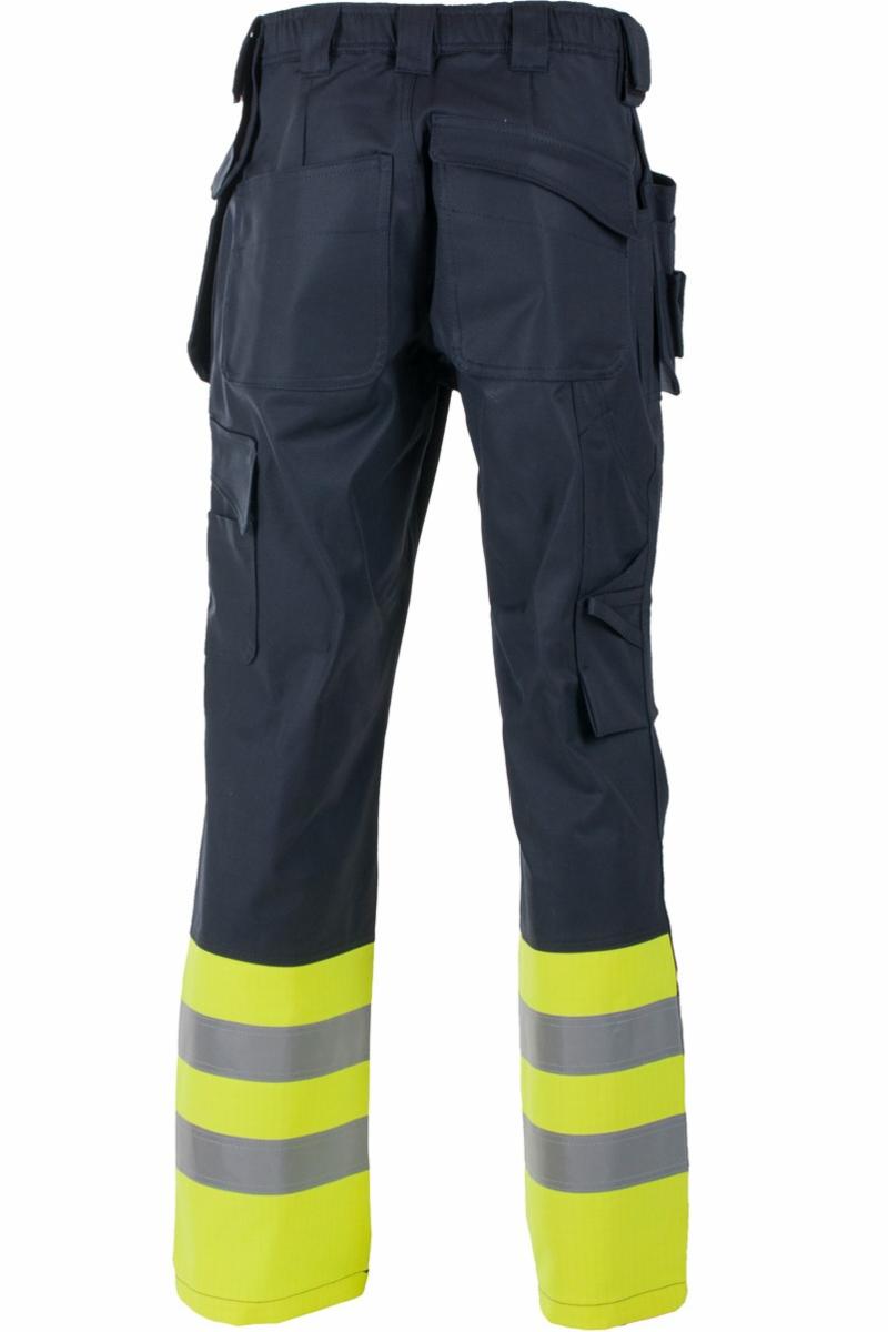 Flammehemmende bukse til håndverkere. Med hengelommer, tommestokklomme, feste for hammerholder og mobillomme. Refleks på bein. To baklommer og lårlomme med klaff.EN 471 klasse 1 EN ISO 11612 A1 B1 C1EN 1149-5IEC 61482-1-2 klasse 1