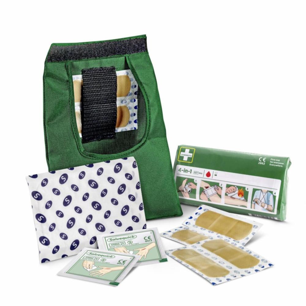 Kan bæres i lomme eller festes på belte. Inneholder produkter for små og store blødninger. Tydelige illustrasjoner på produktenes forpakning som viser hvordan de skal brukes. Førstehjelpsputen passer godt til 1 person.