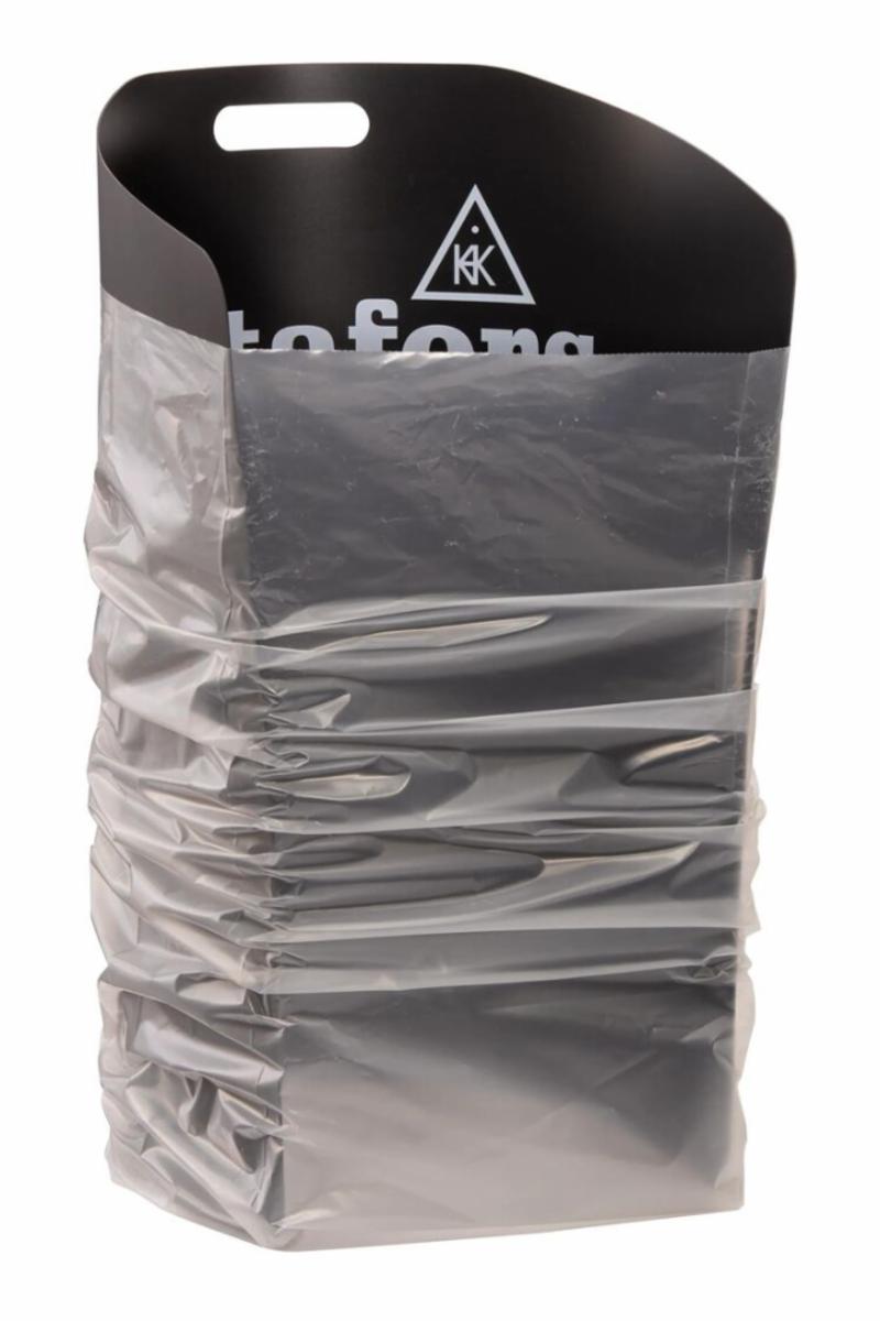Den passer til vanlige avfallssekker fra 65 til 240 liter og gir en stabil og oppreist