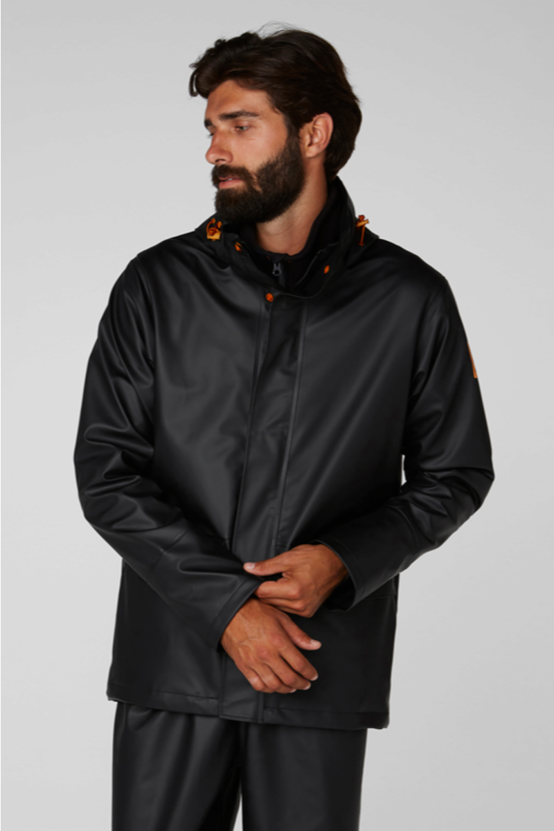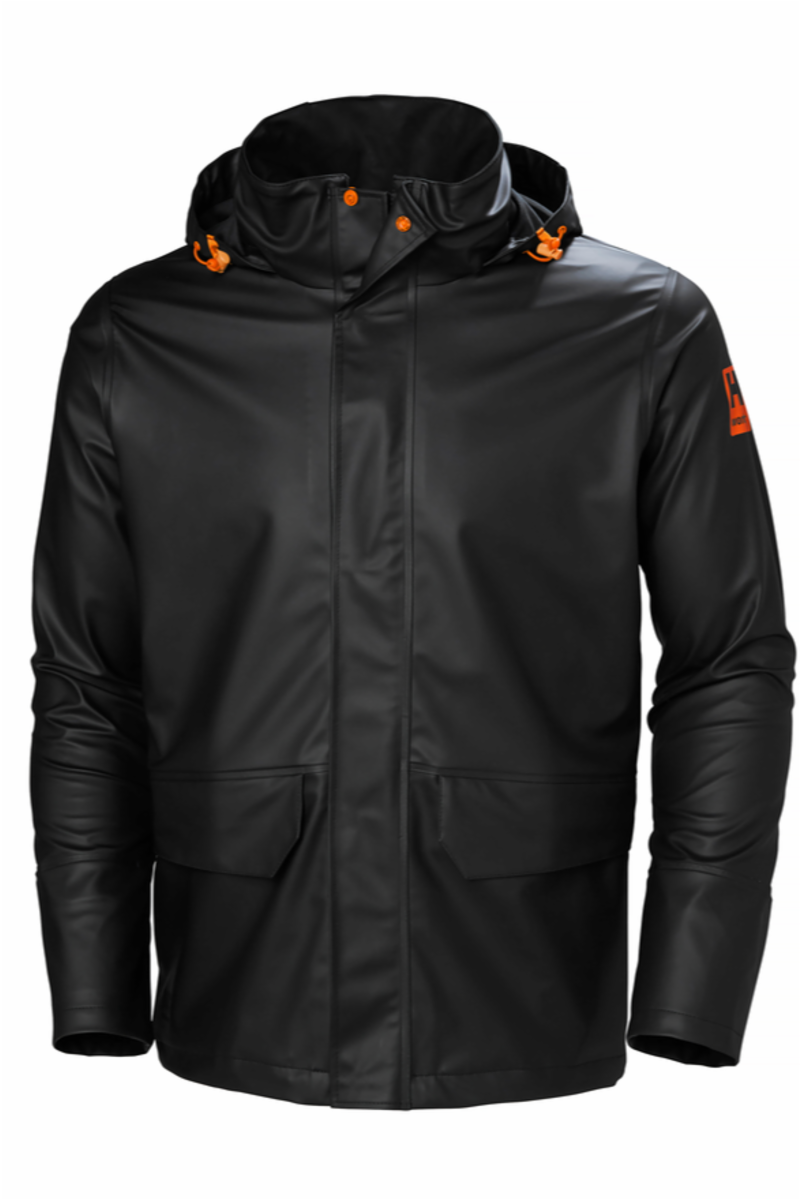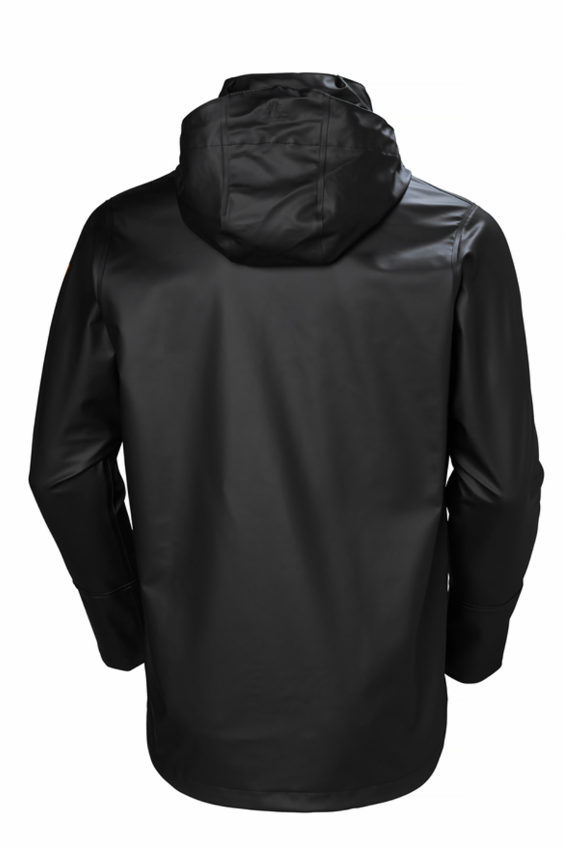 Regnjakke med YKK® glidelås og dobbel stormklaff med trykknapper i front. Forlenget rygg. Hette med elastisk trekksnor. Hetten kan skjules i kraven. Lomme med vertikal YKK® glidelås og åpning for kabel på venstre bryst under stormklaff.