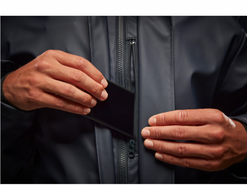 Forlommer med klaff og YKK® glidelås. Hempe for ID-kortholder i venstre forlomme.