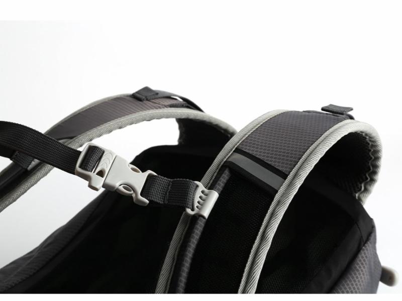 Justerbar bryststropp og hoftebelte med glidelåslommer.