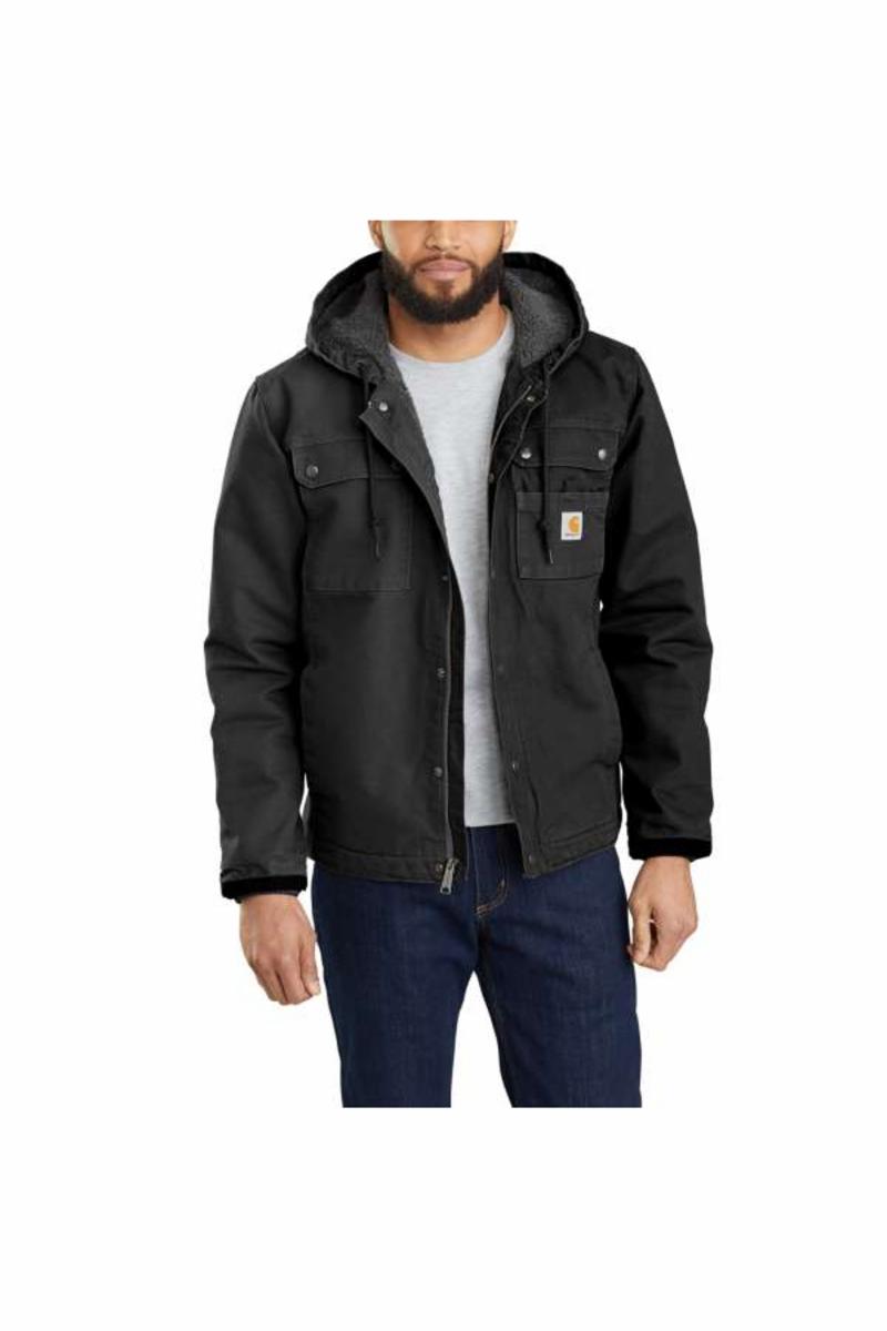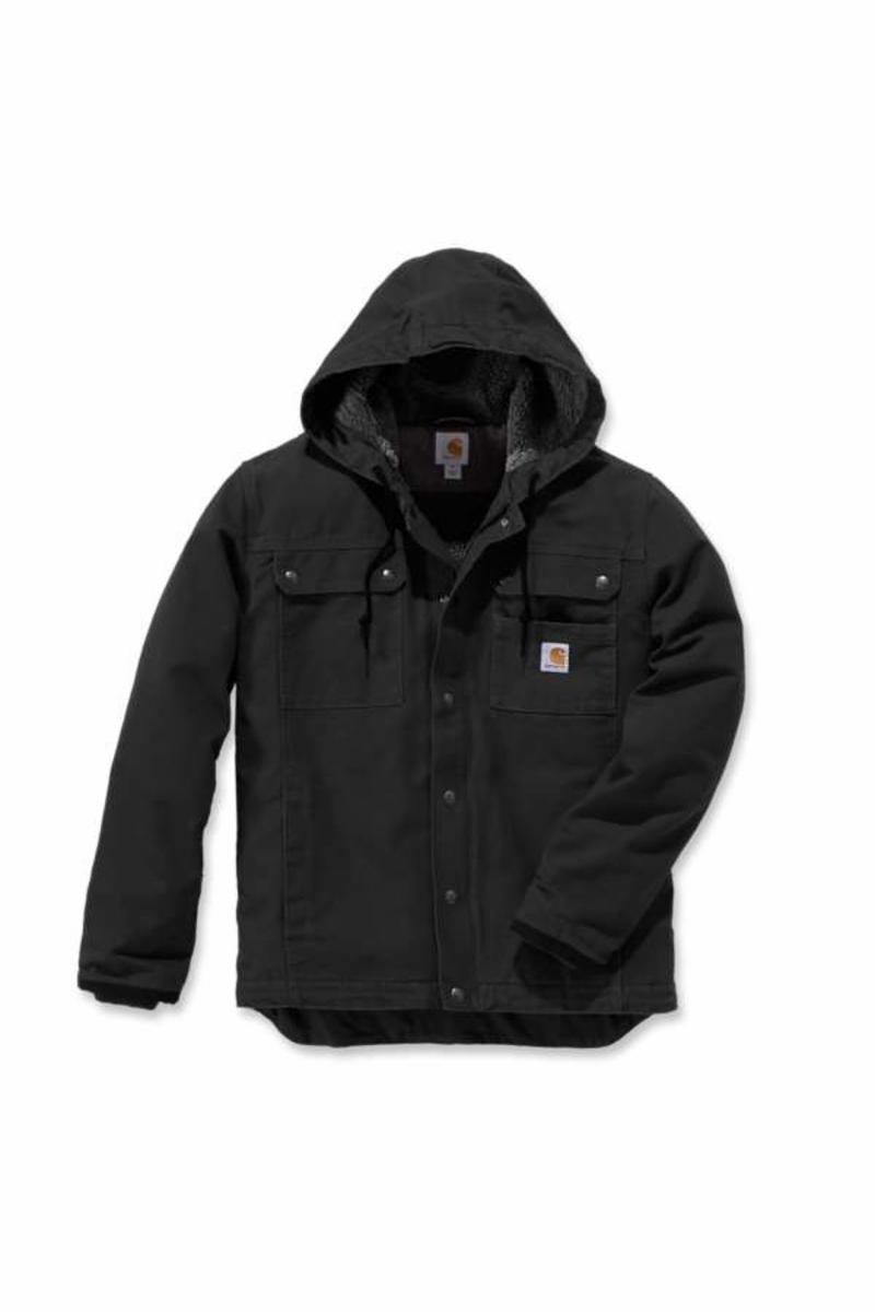 | Carhartt Bartlett Jacket Varm Herre jakke med pelsfôr og integrert hette. Funksjonen: Sherpa fôr i kroppen Vattert fôr i ermene Midt foran glidelås med indre og ytre storm klaff og trykknapplukking To innvendige lommer To brystlommer med trykk klaff lukking To lavere frontlommer Pleated albuer Pleated bi-swing tilbake Drop-tail hem Justerbar snøring nederst i linningen Trippel-sydd viktigste sømmer Spesifikasjoner: 100% bomull ringspunnet Duck Vekt: 407 g/m2 Cordura® forsterket ermet hem med indre rib-strikket mansjett Vedlagt hette med lav profil justering ved hette hemp |