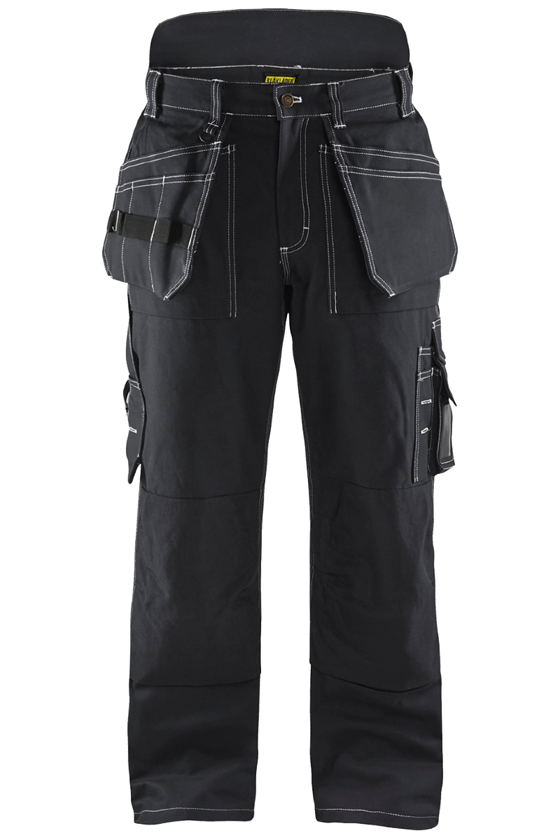 Baklommer med belg. Knelommer. Lårlomme med utenpåliggende pennelomme.
