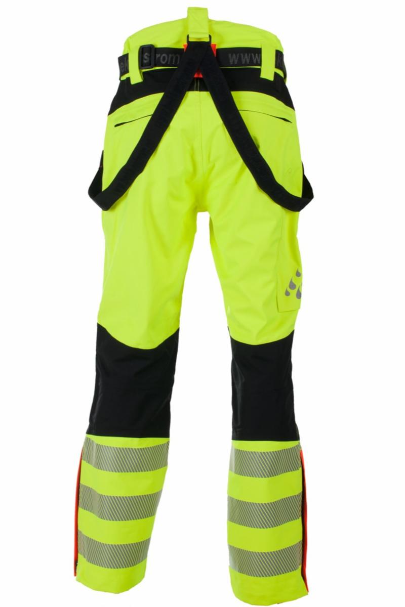 Bukse med 2 lommer med åpning til hengelommer, glidlås for lufting, 2 baklommer med glidelås, glidelås i bein med klaff og tommestokklomme.Litt høyre linning bak.Refleks nede på bein. Vannsøyle: 10000mm. Pustende 5000mvp.EN ISO 20471:2013, klasse 2EN 343:2003+A1:2007, klasse 3, 3