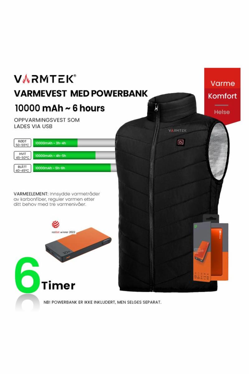 Med en batteribank på 10.000 mAH kan vesten brukes opptil 6 timer ved max temperatur før batteriene må lades.