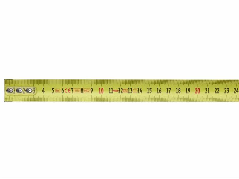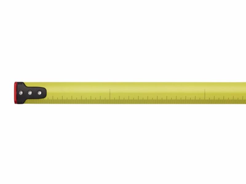 Målebånd i stål med dobbeltsidig gradering for presis måling. Gult stålmålebånd gradert i millimeter med svært nøyaktig blekkstråleteknikk og matt overflate for enkel avlesning. Undersiden har en gradering for CC-mål som forenkler arbeidsoppgaver som oppsett av stendere. Endebeslag av gummi montert med speil for innvendig og utvendig måling, dempende båndretur beskytter endehaken mot skader.