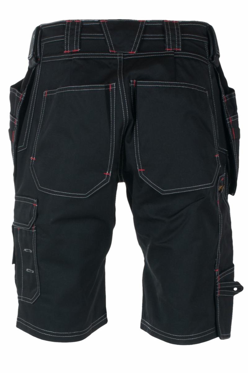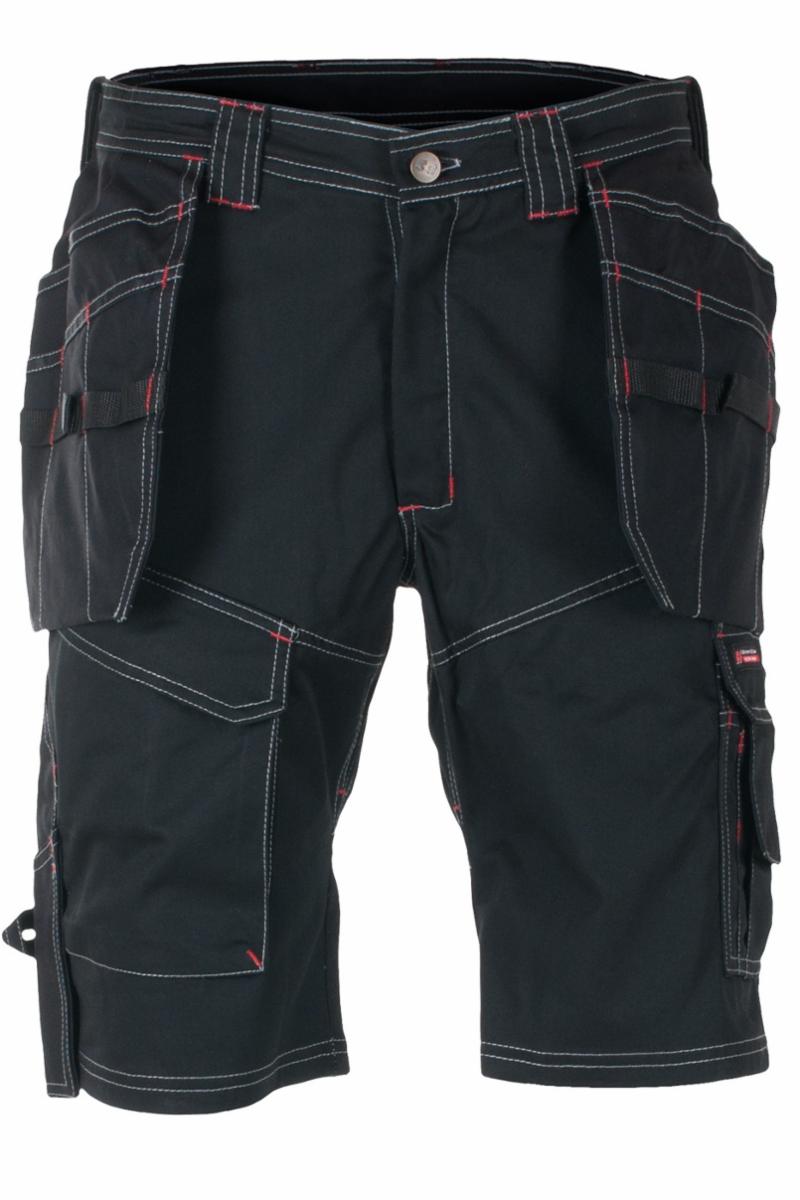 Shorts håndverk med stikklommer i front, hengelommer, baklommer, dobbelt tommestokklomme plassert over sidesøm på buksen. Lårlomme venstre side med mobillomme, lårlomme høyre side med ID-kortlomme. Feste for hammerholder begge sider i linning.