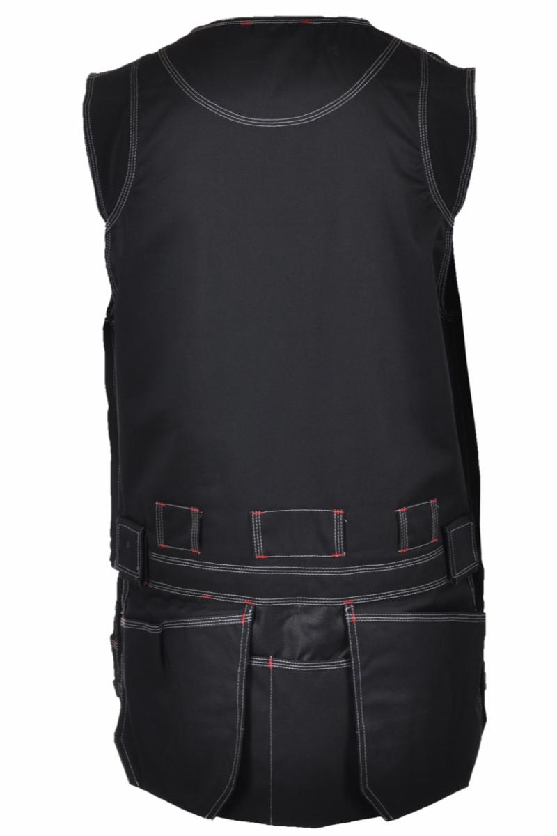 Håndverksvest med glidelås i front, hengelommer foran og bak, mobillomme, feste for hammerholder og to doble brystlommer.