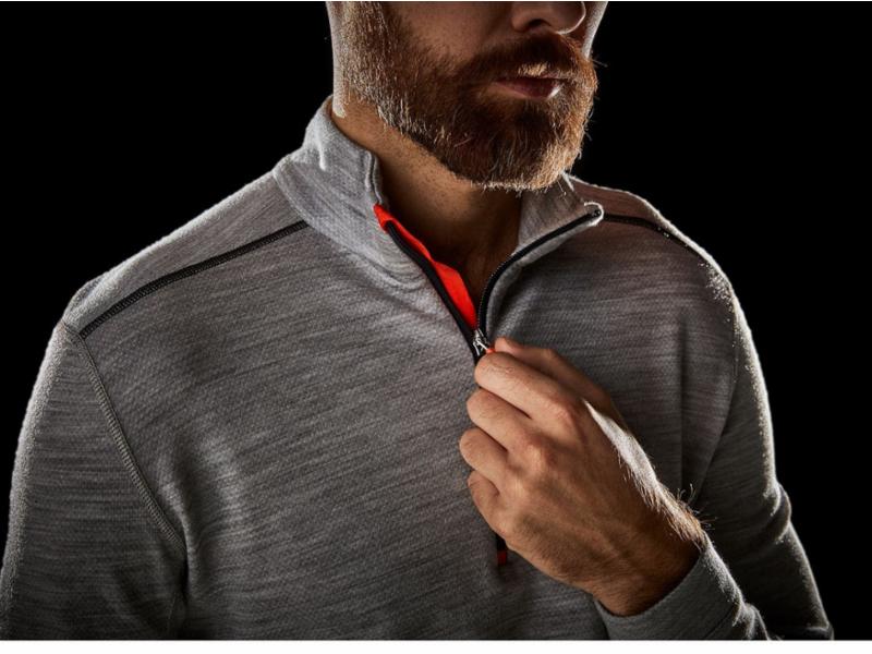 Merinoull for optimal isolasjon. YKK® glidelås i hals med klaff på baksiden og hakebeskyttelse.